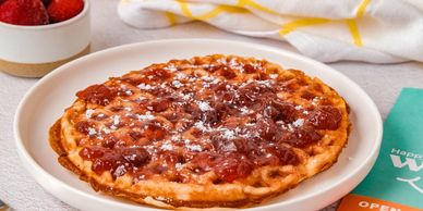 Light, fluffy, and perfectly textured, this waffle is crafted to perfection. Topped with fresh, vibrant strawberry syrup, every bite bursts with flavor. From the golden crispness to the fresh fruit finish, everything about this waffle is pure awesomeness! Try it today at The Happy Chai House!